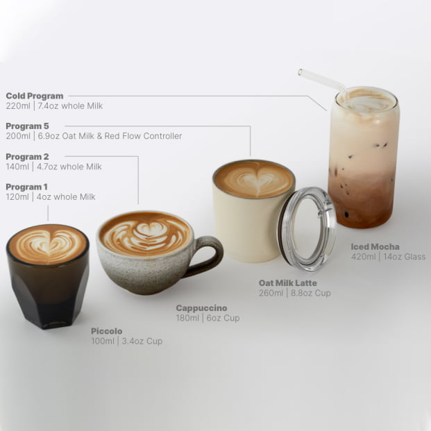 הפעלה: חשמלי 220V | נפח כד: 100-220 מ"ל | 5 תוכניות | כיוון גובה מדחס מגנטי (0.4 מ"מ לקליק) | 3 וסתים מגנטיים | דופן כפולה — קריר למגע | טמפרטורה עד 70°C | מהירות עד 8,000 סל"ד | ציפוי פנימי PFAS-free | אישורי FDA ו-EU | ללא BPA | כולל קורס לאטה ארט דיגיטלי